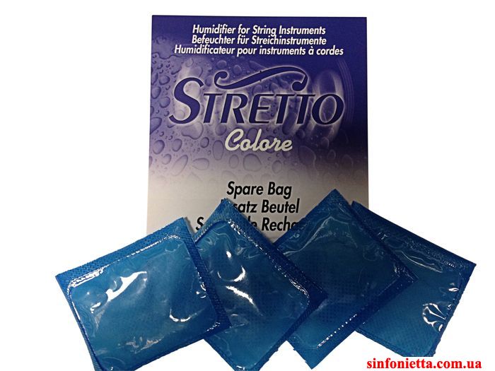 Запасные пакетики для увлажнителя STRETTO colore. Мешочек влажность Stretto кладется на 5 минут в воду, чтобы он мог впитать ее в себя. В течение следующих недель, он будет постоянно медленно отдавать впитанную влагу. Когда мешочек становится сухой, просто повторите процедуру. Так обеспечивается необходимая влажность воздуха не только для музыкального инструмента, но и для смычка с волосом (чувствителен к уровню влажности).