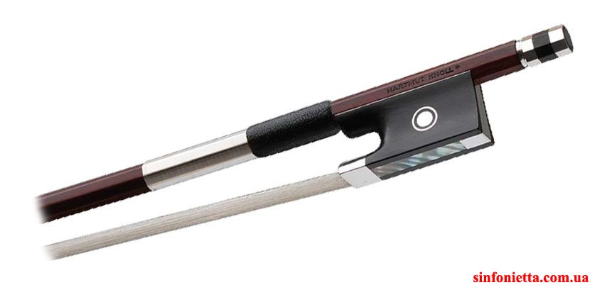 Высококачественный мастеровой смычок Hartmut Knoll Silver для скрипки - тонкая работа мастера. Трость - граненая, фернамбук, колодка из черного дерева с отделкой из серебра, головка винта из 3х частей, серебро + черное дерево.