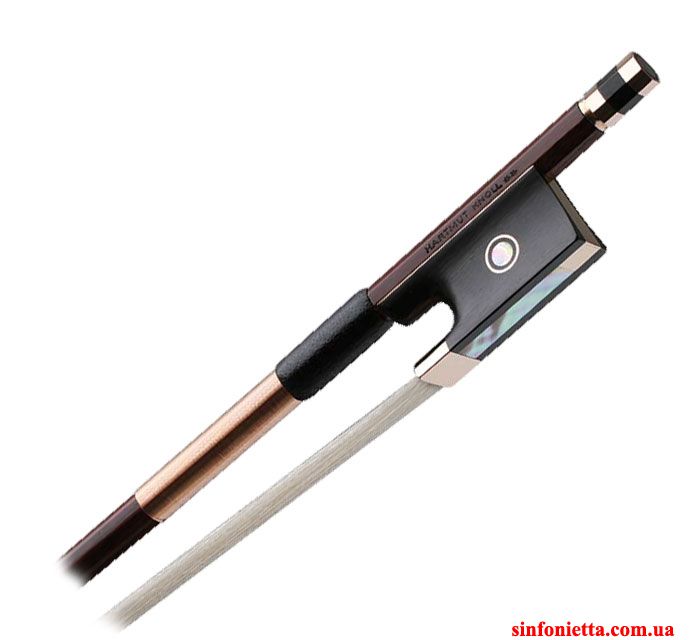 Высококачественный мастеровой смычок Hartmut Knoll Gold для скрипки - тонкая работа мастера. Трость - граненая, фернамбук, колодка из черного дерева с отделкой из золота, головка винта из 3х частей, золото + черное дерево.