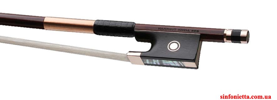 Высококачественный мастеровой смычок Hartmut Knoll Gold 16ct для скрипки - тонкая работа мастера. Трость - круглая, фернамбук, колодка из черного дерева с отделкой из золота 16ct, головка винта из 3х частей, золото + черное дерево.