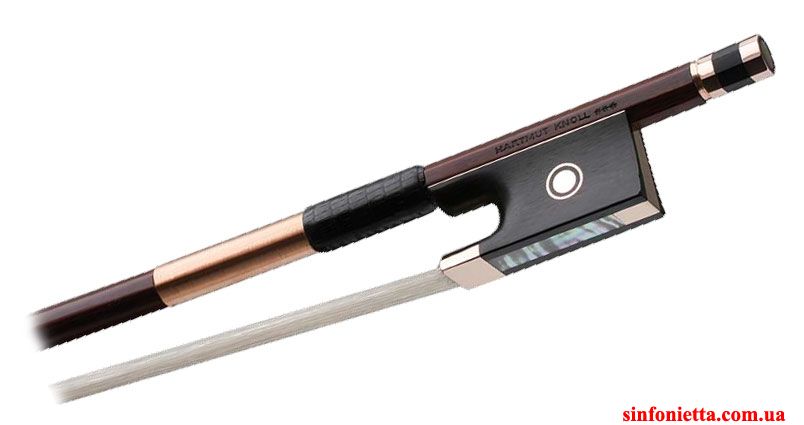 Высококачественный мастеровой смычок Hartmut Knoll Gold 16ct для скрипки - тонкая работа мастера. Трость - круглая, фернамбук, колодка из черного дерева с отделкой из золота 16ct, головка винта из 3х частей, золото + черное дерево.