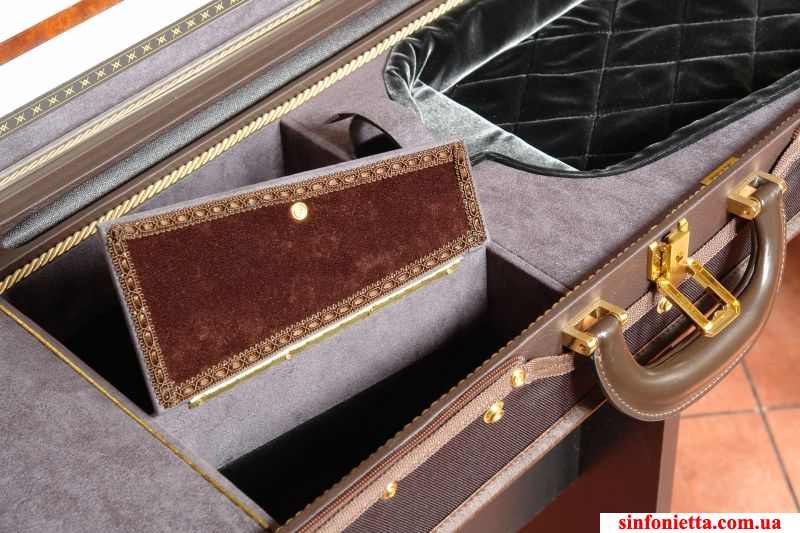 Изготовлен из итальянских материалов высочайшего качества. Модель Aeternum - в дизайне с округлыми краями. Асимметричное крепление инструмента внутри футляра. Скрипка размещается в футляре таким образом, что она находится в центральном отделении с большим открытым пространством с областью вокруг шейки и головы инструмента. Обеспечивается максимальная защита для инструмента. Отделение для аксессуаров в закрытом отсеке. Новый дизайн обеспечивающий максимальную легкость для данного футляра. Исключительно шикарный интерьер с глубокой обивкой полностью выполненной из тончайшего шелка, бархата и замши "Royale". Ручная работа - Мастерская Dimitri Musafia.