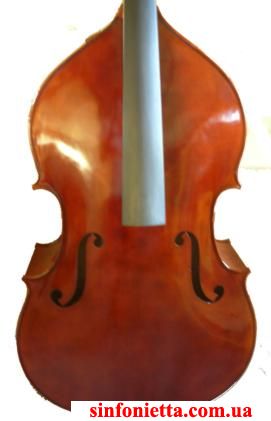 Контрабас с очень хорошим звуком. Задняя дека из цельного клена, верхняя дека из ели. Черного дерева гриф, подставки и подгриф в комплекте. Фактура дерева с умеренным количеством лучей, темнокоричневый лак, "скрипичная" форма.