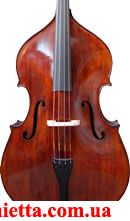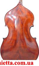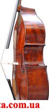 Контрабас с замечательным хорошим звуком. Задняя дека и обечайки из цельного клена, верхняя дека из ели. Черного дерева гриф, подставка и подгриф в комплекте. Красивая фактура дерева с яркой фактурой (лучами), темнокоричневый лак, "скрипичная" форма.